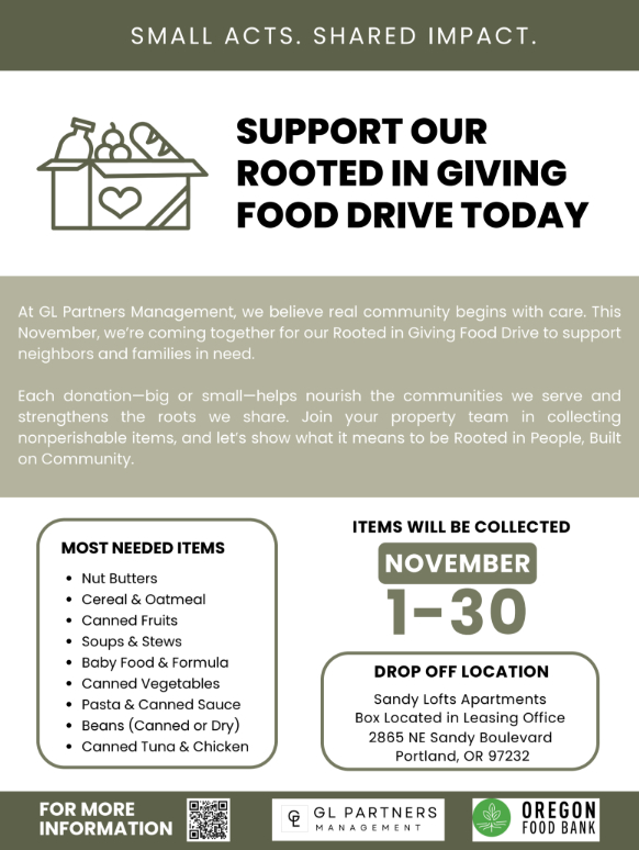 Each donation—big or small—helps nourish the communities we serve and strengthens the roots we share. Join your property team in collecting